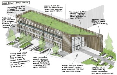 The proposed site will consist of a warehouse, which includes a three storey main office and a two storey hub office. These units will be surrounded by a 25m landscape barrier, which will include an amenity area, offering an outdoor gym, woodland walk, and picnic benches.